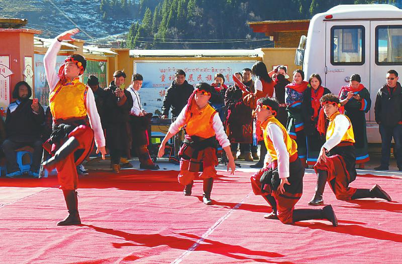 歡快的節(jié)奏,嘹亮的歌聲,表演者飛舞著的白色、紅色、黃色長袖……1月17日中午,四川省阿壩藏族羌族自治州壤塘縣“脫貧春晚”在上杜柯鄉(xiāng)吉拉村首秀。當(dāng)?shù)?00余名群眾觀看表演,有的趴在圍墻上專注地錄視頻,有的站在凳子上拍照,還有小朋友隨著音樂在開闊處起舞。