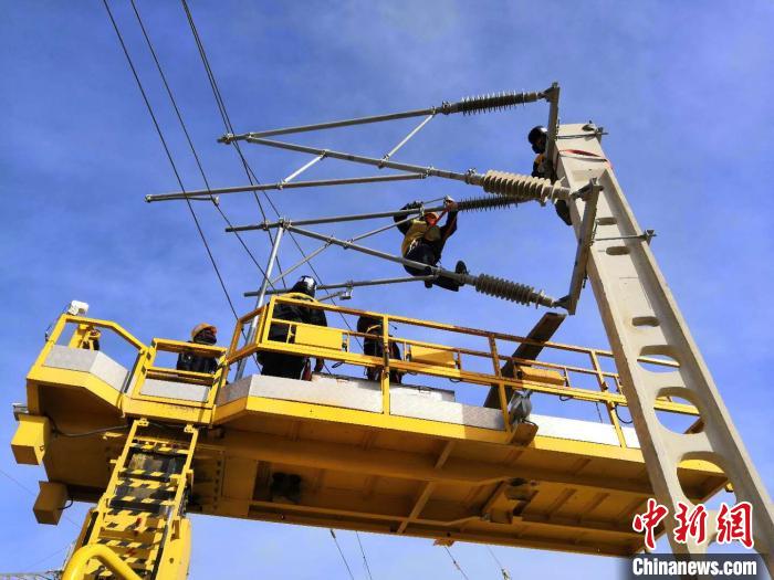 圖為中國鐵路青藏集團(tuán)有限公司西寧供電段格爾木接觸網(wǎng)大修工區(qū)的接觸網(wǎng)工進(jìn)行檢修作業(yè)。周賀 攝