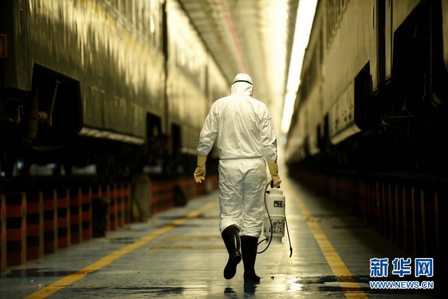 工作人員對(duì)每一列旅客列車進(jìn)行消毒作業(yè)。新華網(wǎng) 郝寶君 攝