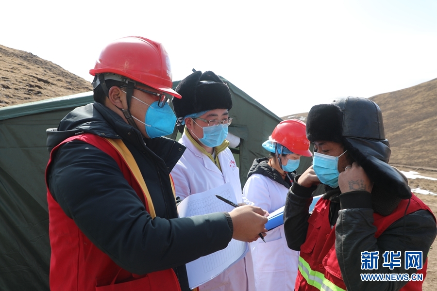 青海-河南±800千伏特高壓工程青2標(biāo)進(jìn)行復(fù)工后人員測溫、防護(hù)用品發(fā)放。新華網(wǎng) 鄒建華 攝