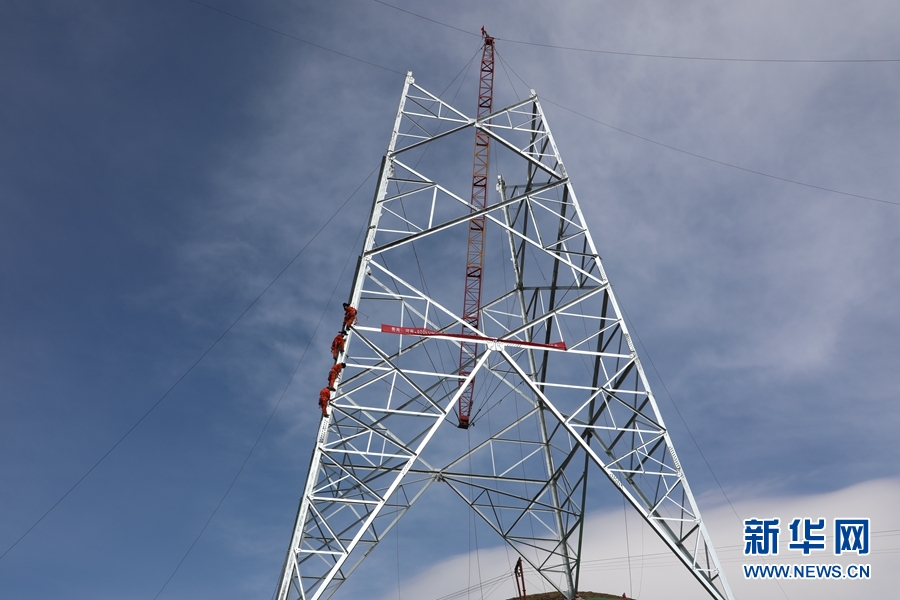 青海-河南±800千伏特高壓工程青2標(biāo)復(fù)工現(xiàn)場,施工人員進(jìn)行組塔作業(yè)。新華網(wǎng) 鄒建華 攝