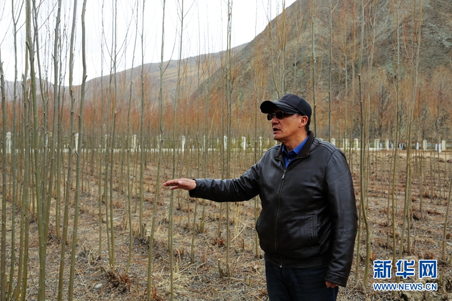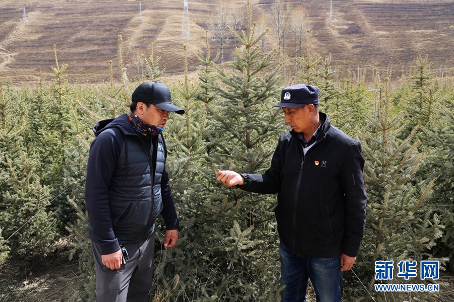 公保旦增(右)與扎巴江才正在查看樹木長勢情況。新華網 卡婭梅朵 攝