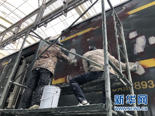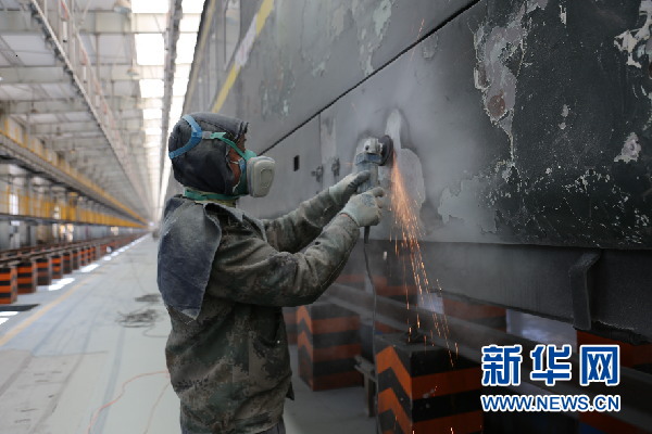 工人在對(duì)列車進(jìn)行外皮打磨作業(yè)。新華網(wǎng)發(fā)