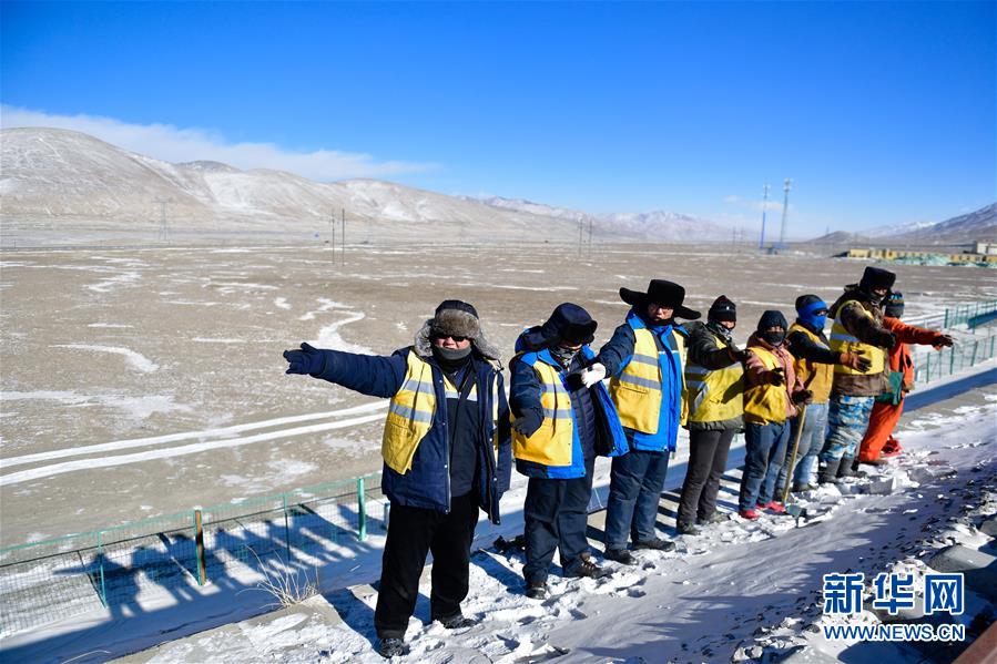 1月11日,在青藏鐵路望昆站附近,于本蕃(左一)和工友們?cè)谑┕で斑M(jìn)行安全檢查。新華社記者 張龍 攝