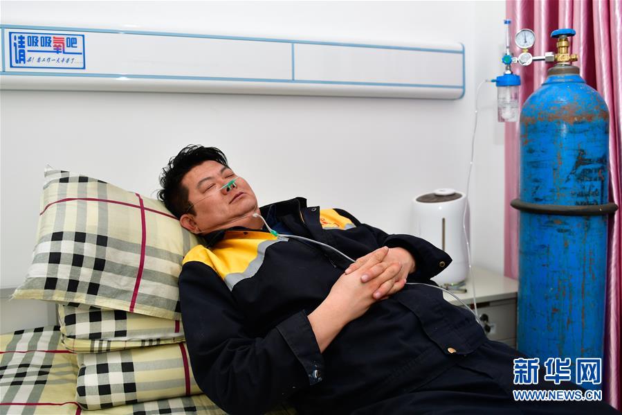 1月11日,在青藏鐵路望昆站,于本蕃在宿舍里吸氧休息。新華社記者 張龍 攝