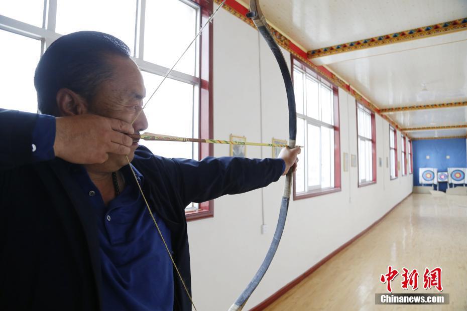 4月22日,青海省尖扎縣傳統(tǒng)牛角弓制作技藝代表性傳承人奧松多杰在車間射箭場(chǎng)內(nèi)測(cè)試制作好的牛角弓。當(dāng)日,在青海省尖扎縣,奧松多杰和徒弟們經(jīng)過切割,打磨水牛角和竹片、貼筋、繪圖等技藝,純手工制作出藏式傳統(tǒng)牛角弓。中新社記者 馬銘言 攝
