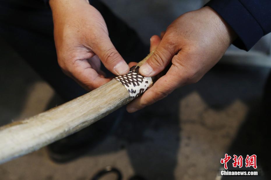 4月22日,青海省尖扎縣傳統(tǒng)牛角弓制作技藝代表性傳承人奧松多杰將蛇皮貼于已經(jīng)陰干的牛角弓上。當(dāng)日,在青海省尖扎縣,奧松多杰和徒弟們經(jīng)過切割,打磨水牛角和竹片、貼筋、繪圖等技藝,純手工制作出藏式傳統(tǒng)牛角弓。中新社記者 馬銘言 攝