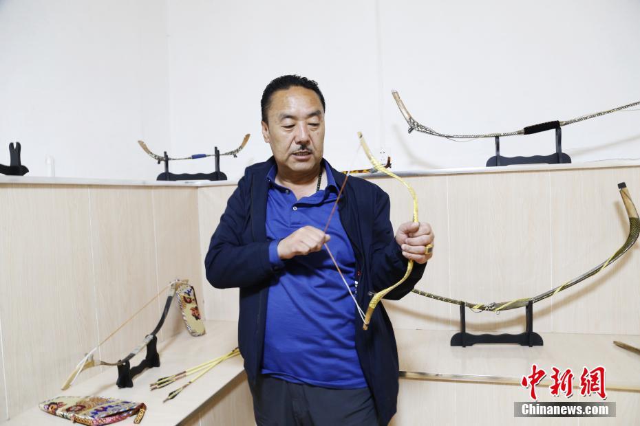 4月22日,青海省尖扎縣傳統(tǒng)牛角弓制作技藝代表性傳承人奧松多杰展示自己與徒弟制作的藏式傳統(tǒng)牛角弓。當(dāng)日,在青海省尖扎縣,奧松多杰和徒弟們經(jīng)過切割,打磨水牛角和竹片、貼筋、繪圖等技藝,純手工制作出藏式傳統(tǒng)牛角弓。中新社記者 馬銘言 攝