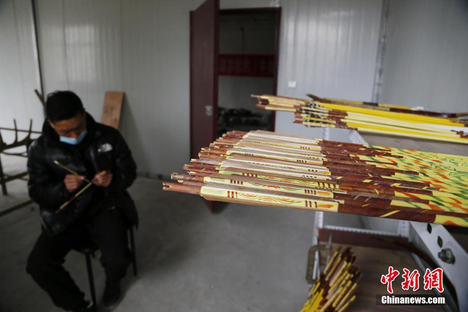 4月22日,青海省尖扎縣傳統(tǒng)牛角弓制作技藝代表性傳承人奧松多杰的一位徒弟用毛筆在箭上繪制具有藏族特色的圖案。當(dāng)日,在青海省尖扎縣,奧松多杰和徒弟們經(jīng)過切割,打磨水牛角和竹片、貼筋、繪圖等技藝,純手工制作出藏式傳統(tǒng)牛角弓。中新社記者 馬銘言 攝