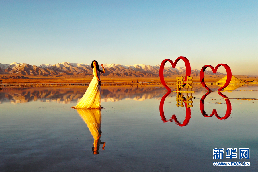夕陽(yáng)下的茶卡鹽湖。新華網(wǎng) 潘彬彬攝