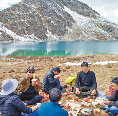 劉學燦(左二)和鄉(xiāng)親們一起爬上海拔5000米的朵絨麻措湖,考察道路交通情況。宋豪新 攝