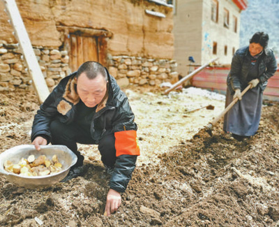 劉學燦(左)幫助農牧民群眾種植土豆。宋豪新 攝