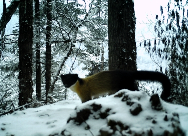 此次拍攝到的視頻資料顯示,在保護(hù)區(qū)多個(gè)點(diǎn)位都有大熊貓活動(dòng)的身影,并且出現(xiàn)了多次,其中在同一區(qū)域,兩次拍到大熊貓嗅味樹標(biāo)記行為;在同一點(diǎn)位同時(shí)拍攝到大熊貓、川金絲猴、金貓、黃喉貂、黑熊、毛冠鹿、野豬、豪豬等8種動(dòng)物活動(dòng)影像。此外,保護(hù)區(qū)還首次拍攝到金貓活動(dòng)影像。