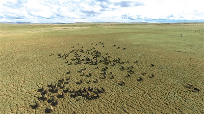 草原返青后,曲麻日合作社的牛群被放出畜棚,散落在廣袤草場上。張海麟 攝