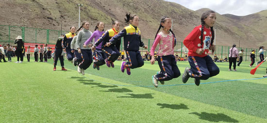 新修的操場(chǎng)是他“套路”到的,400米的標(biāo)準(zhǔn)跑道,比縣里小學(xué)的那個(gè)還好。這原本是鄉(xiāng)里的文體設(shè)施,班瑪多杰軟磨硬泡,央求著領(lǐng)導(dǎo)批準(zhǔn),把這個(gè)操場(chǎng)修到了學(xué)校旁邊?!傲弧敝?,一場(chǎng)運(yùn)動(dòng)會(huì)就在這個(gè)操場(chǎng)上舉辦了。跑步,拔河,跳遠(yuǎn)……