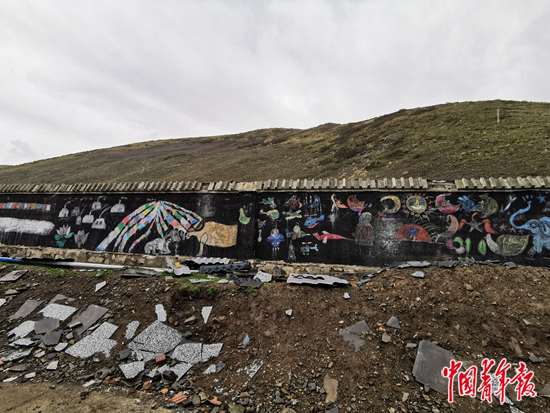 學(xué)校里有一面墻,現(xiàn)代文明的痕跡與傳統(tǒng)游牧的習(xí)俗,被學(xué)生們畫在了一起。畫上有五彩經(jīng)幡、雪山羊群,有絢麗的格?;ê蜏嘏臍址浚约按┲嘏鄞笮Φ暮⒆?。畫上還有直升飛機(jī)、火箭和飛碟。