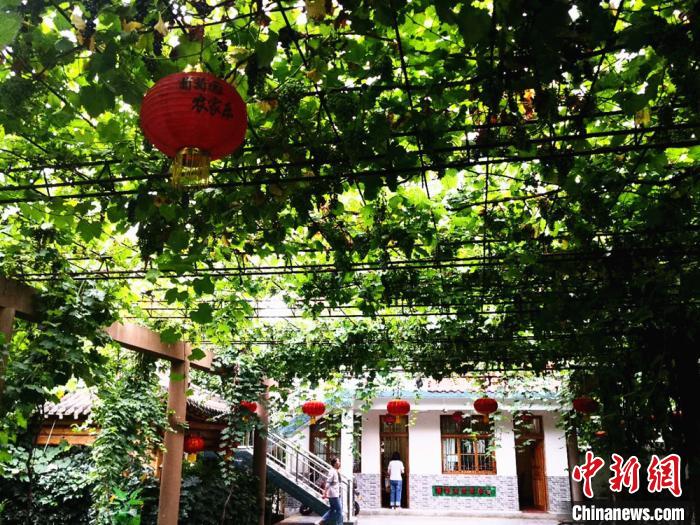 7月,中新網(wǎng)記者走進(jìn)韓謝軍的農(nóng)家樂,庭院中滿是掛滿果實(shí)的葡萄架長廊,葡萄枝葉連成片,濃密的樹蔭遮蔽了夏日炎炎。