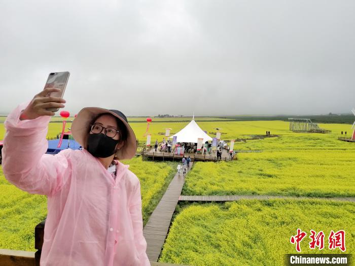 記者在油菜花海內(nèi)看到,雖然當(dāng)天下著雨,仍然有前來(lái)游玩的游客,當(dāng)?shù)厥忻褛w金花說(shuō),疫情后這是他們一家人第一次來(lái)油菜花海游玩,走在一望無(wú)際的花海里心情特別輕松。