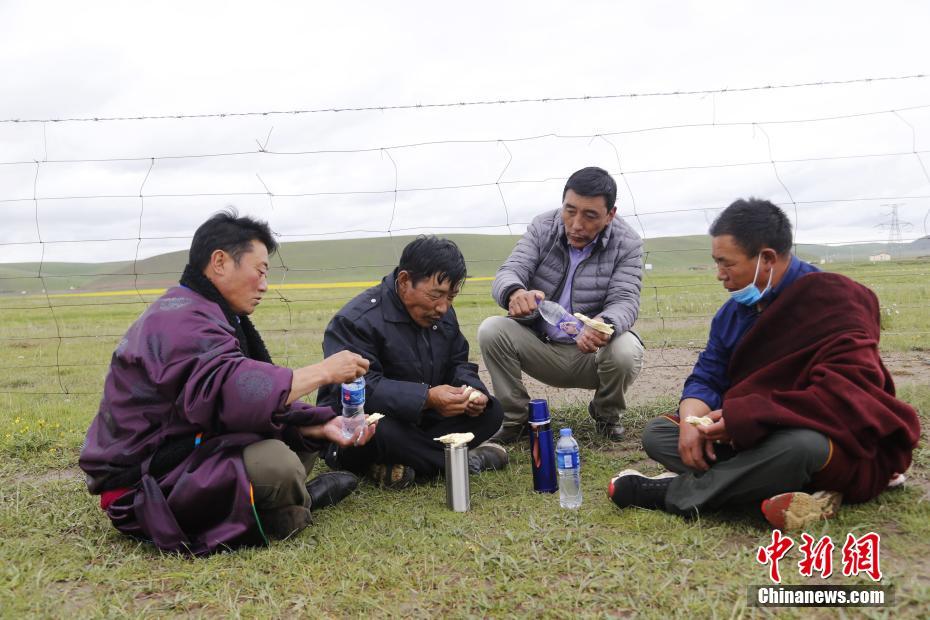 7月21日,青海省海北藏族自治州剛察縣伊克烏蘭鄉(xiāng)剛察貢麻村的索南木旦巴(左一)、仁增才讓(左二)、吉科加(右二)、萬瑪扎西(右一)四人在撿拾著草場垃圾途中,吃餅子,喝礦泉水充饑。2008年,萬瑪扎西路在村支書的支持下,與索南木旦巴、仁增才讓、吉科加三個人組建了義務環(huán)保隊,自此一干就是12年。他們在撿拾垃圾的同時進行著環(huán)保宣傳,希望從源頭減少垃圾。仁增才讓說:“現在草原上的垃圾幾乎是看不到了?!敝行律缬浾?馬銘言 攝