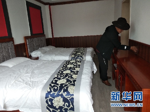 格日扎西正在打掃客房。新華網(wǎng) 宋燕 攝