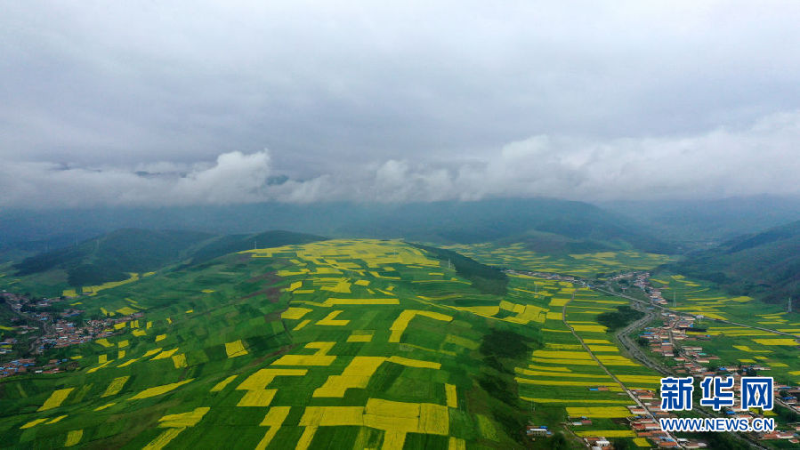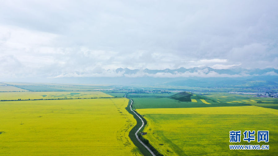 這是7月23日拍攝的門源回族自治縣境內(nèi)的油菜花(無人機(jī)照片)。新華社記者 吳剛 攝