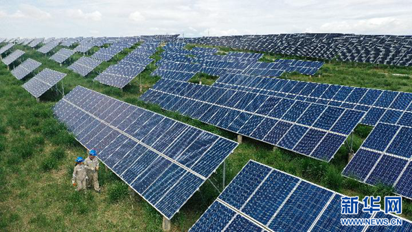 7月8日,在青海省海南藏族自治州共和縣,大唐青海公司新能源分公司兩名工作人員在光伏電站內(nèi)巡檢(無(wú)人機(jī)照片)。新華社記者 張宏祥 攝
