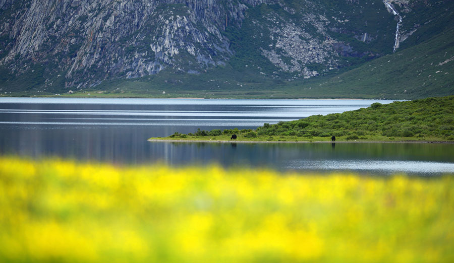 圖為在湖水對(duì)岸,兩只牦牛悠閑走著。劉歡 攝