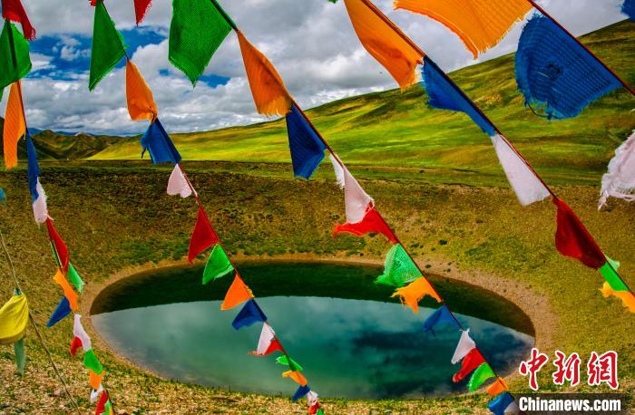 圖為經幡下的碧綠湖水。功霸扎西達杰 攝