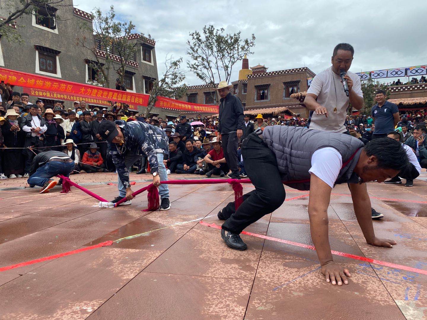 現(xiàn)場兩名運(yùn)動員俯下身去,脖子上套上同一根長綢布帶,正在做著賽前的準(zhǔn)備工作。“嗶——”一聲哨響過后,雙方運(yùn)動員四肢著地,往相反的方向奮力爬行,布帶隨之被拉直繃緊,賽場氣氛也隨即變得緊張……這種趴著拔河的體育項(xiàng)目叫做格吞,也叫“藏式拔河”。