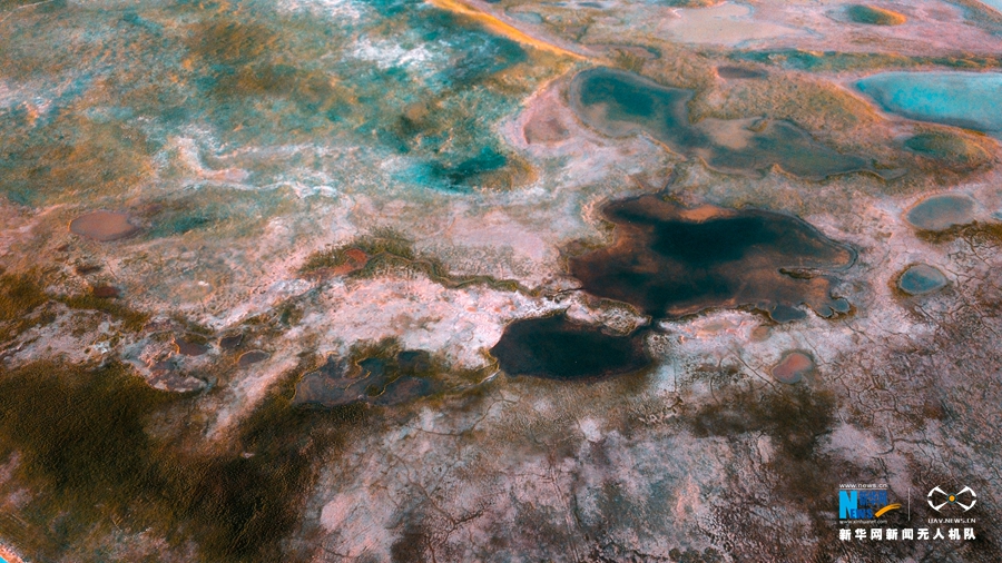 天空中的晚霞與地上的湖泊形成了獨特的美景。(航拍圖)新華網(wǎng) 宋忠勇 攝