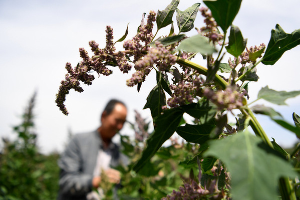 8月2日,天祝藏族自治縣松山鎮(zhèn)大溝興農(nóng)種養(yǎng)殖專業(yè)合作社負(fù)責(zé)人文玉廷在地里查看藜麥生長情況。陳斌 攝