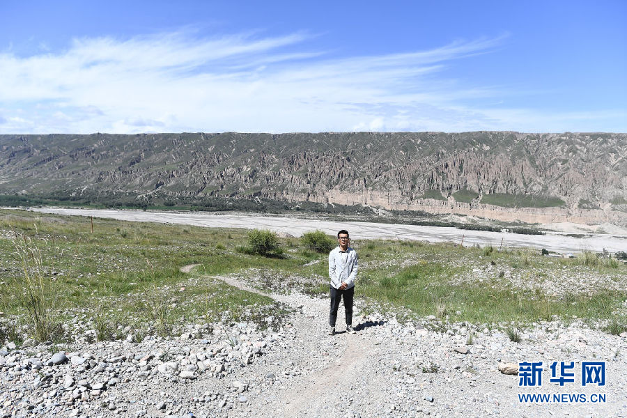 8月13日,尤拉太在夏塘村留影,他身后的山路是他上小學時步行前往學校的必經(jīng)之路。新華社記者 張宏祥 攝