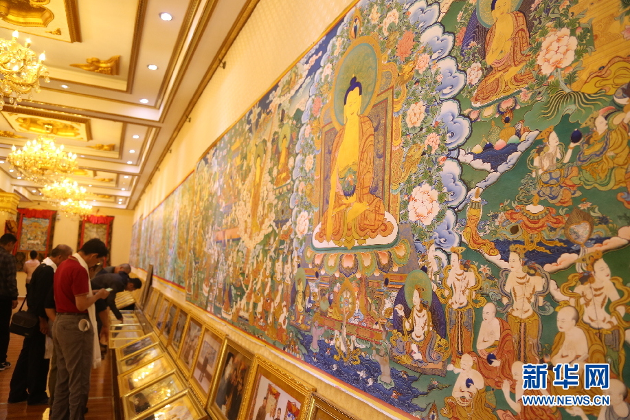 在龍樹(shù)花苑的展示大廳,游客正在觀賞展出的唐卡作品。新華網(wǎng) 卡婭梅朵攝