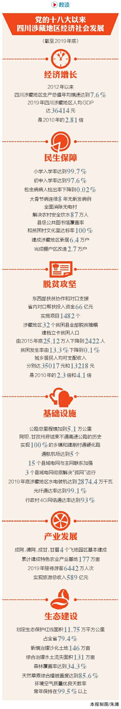 省委涉藏辦相關負責人告訴記者,近年來四川省涉藏地區(qū)加快發(fā)展特色優(yōu)勢產(chǎn)業(yè),推動全域旅游、高原農(nóng)牧業(yè)、清潔能源、民族手工藝等提質(zhì)增效。依托大熊貓、大九寨、大香格里拉、大草原等特色資源,涉藏地區(qū)大力發(fā)展全域旅游,“凈土阿壩”“圣潔甘孜”“大涼山”品牌影響力不斷提升,阿壩州、甘孜州成功創(chuàng)建首批國家級全域旅游示范區(qū),2019年接待游客6442萬人次、實現(xiàn)旅游總收入589億元。涉藏地區(qū)重點發(fā)展高原牦牛、特色果蔬、釀酒葡萄、優(yōu)質(zhì)青稞、道地中藏羌藥材、野生食用菌等產(chǎn)業(yè),基本建成成阿、德阿、成甘、甘眉4個飛地園區(qū);大力推進清潔能源建設,水電裝機容量達到2875.6萬千瓦。截至2019年底,四川涉藏地區(qū)人均GDP達到36414元,是2010年的2.81倍;城鄉(xiāng)居民人均可支配收入分別達到35017元、13218元,接近全省平均水平,向2020年底實現(xiàn)全面同步小康邁出了堅實一步。