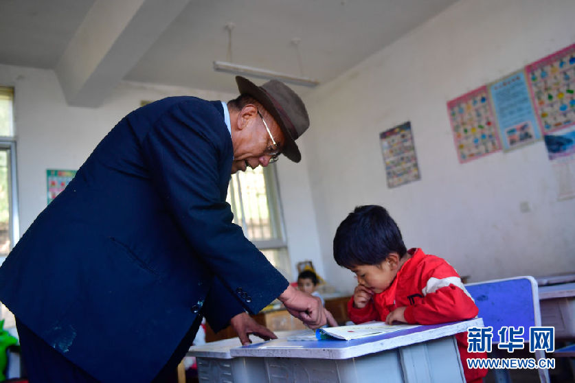 8月31日,在來塘村學(xué)校,完么仁增老師在指導(dǎo)一年級學(xué)生馬文輝學(xué)習(xí)。新華社記者 張龍 攝