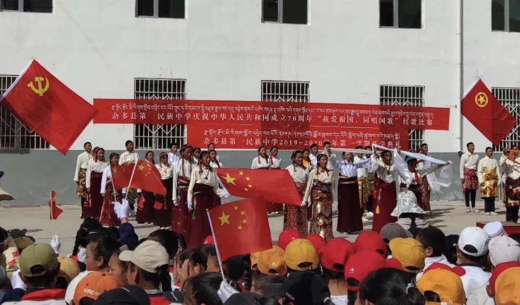 雜多縣第一民族中學的學生正在參加“慶祝中華人民共和國成立70周年”歌唱比賽活動。 本文受訪者供圖