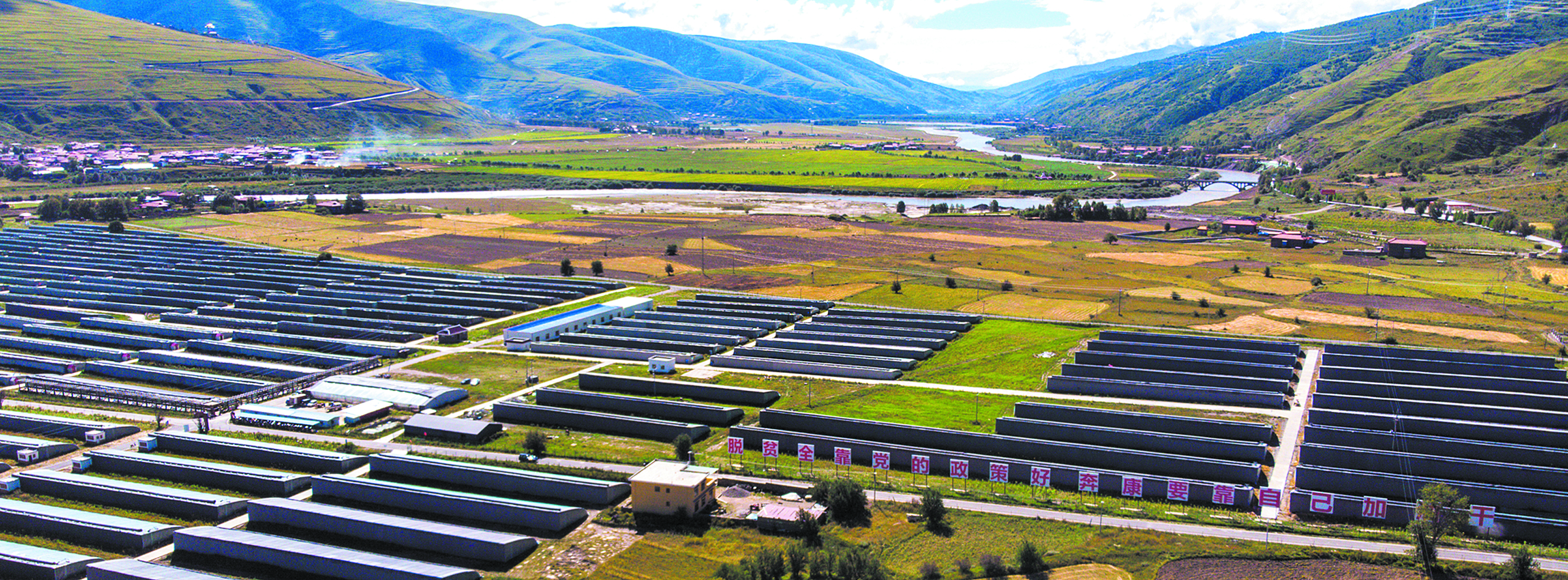 湛藍(lán)的天空中漂浮著片片白云,靜靜的鮮水河在一座座披著綠色盛裝的大山間流淌,河谷的開(kāi)闊地帶,一座座蔬菜大棚整齊地排列著,遠(yuǎn)遠(yuǎn)望去,猶如披上綠裝的蒙古包,連綿不斷,與湛藍(lán)的天空交相輝映。