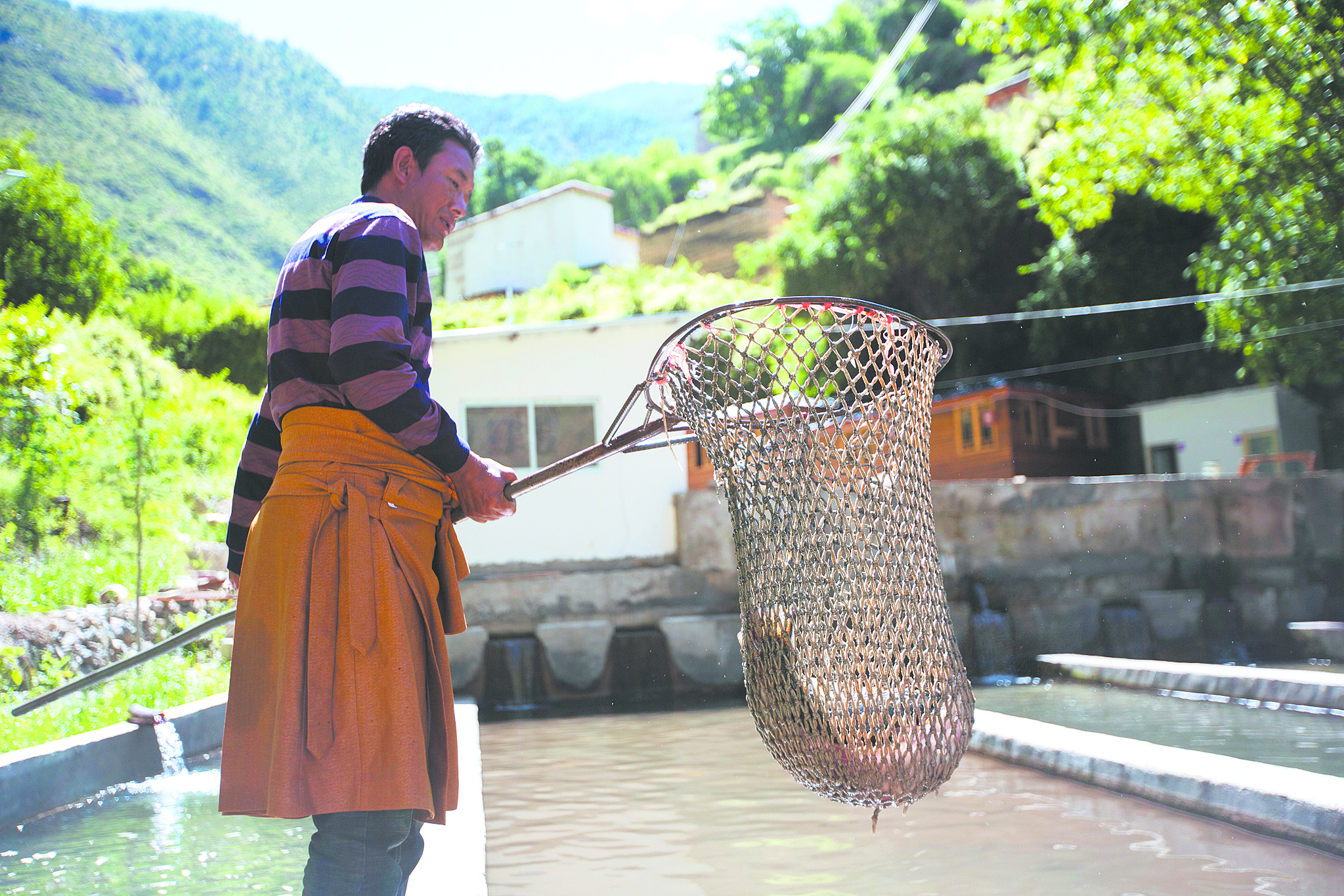 在成品魚(yú)池前,38歲的藏族老鄉(xiāng)彭錯(cuò)正拿著網(wǎng)兜撈魚(yú)。今天有買家來(lái)看魚(yú),他負(fù)責(zé)撈幾條樣品給人看。用攔截網(wǎng)片把魚(yú)群逼到狹窄的水道內(nèi),彭錯(cuò)熟練地拿起網(wǎng)兜在水中一攪,兩條肥碩的裂腹魚(yú)從水塘中一躍而起,褐色的鱗片在陽(yáng)光下閃閃發(fā)光。彭錯(cuò)不慌不忙,牢牢把住網(wǎng)兜左右一揮,兩條大魚(yú)便被捕入網(wǎng)中?!爸辽儆腥慕镏?,肉質(zhì)緊實(shí),品質(zhì)很不錯(cuò)!”趕來(lái)查看的買家一邊抓魚(yú)一邊夸贊。