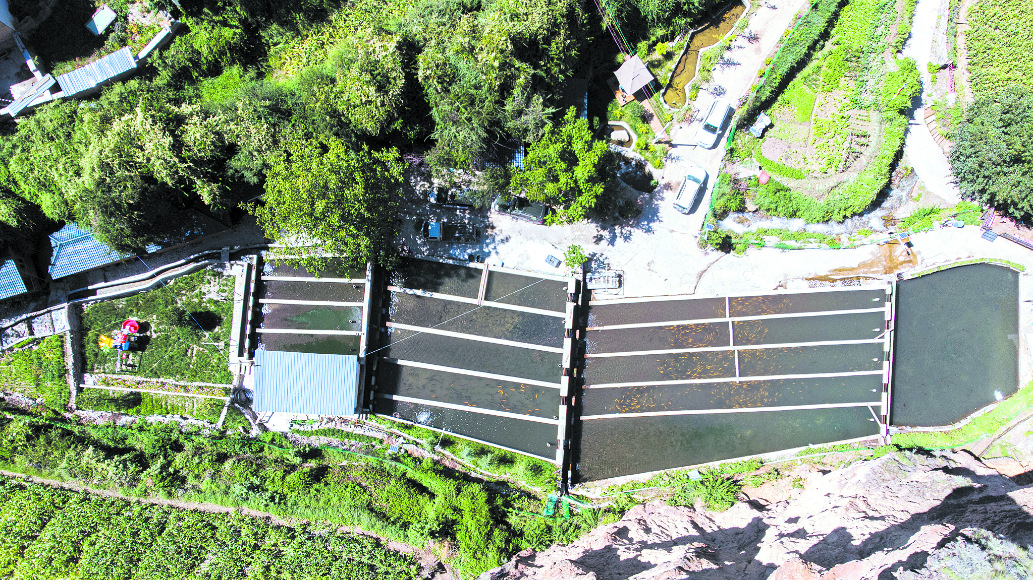 采訪車沿215國(guó)道在山谷間蜿蜒,定曲河水碧藍(lán)清亮。從莫木溝一路翻山而上,快到山頂時(shí),一座高山冷水魚(yú)養(yǎng)殖魚(yú)場(chǎng)呈現(xiàn)眼前。
