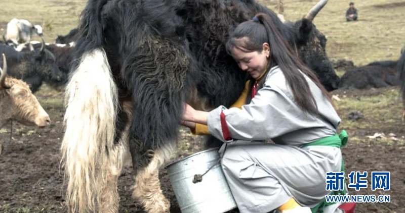 爐霍縣的牧民正在擠牦牛奶。