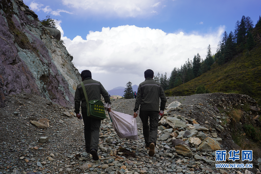 祁連山國家公園青海片區(qū)油葫蘆管護站的生態(tài)管護員在撿拾垃圾(9月9日攝)。新華社記者 藍翔 攝