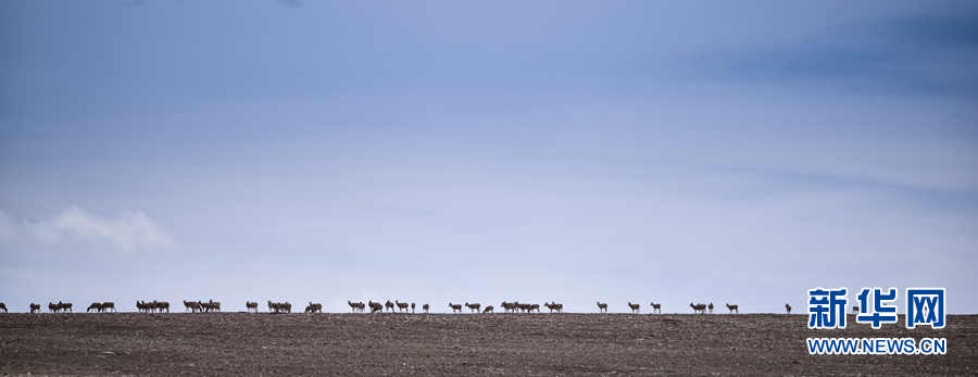 青??煽晌骼锏貐^(qū),一群雌性待產(chǎn)藏羚羊通過青藏公路后向卓乃湖行進(jìn)(2016年6月7日攝)。新華社記者 吳剛 攝