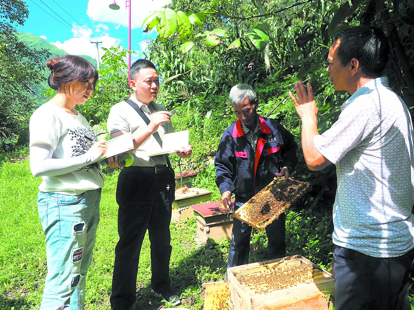 回轉(zhuǎn)身去,蒲江縣對(duì)口援助瀘定工作隊(duì)隊(duì)長(zhǎng)吳孟賢正和張洪彬攀談著今年的蜜蜂增收情況。“蒲江縣新增財(cái)政幫扶資金277萬(wàn)元作為獎(jiǎng)補(bǔ)資金,激勵(lì)成都三千米甜蜂業(yè)有限公司落戶(hù)瀘定發(fā)展的‘貢嘎中蜂’養(yǎng)殖支援項(xiàng)目,現(xiàn)在已經(jīng)累計(jì)發(fā)放貢嘎中蜂7500余群,幫助全縣38個(gè)貧困村發(fā)展村級(jí)集體經(jīng)濟(jì),示范帶動(dòng)800戶(hù)以上貧困戶(hù)增收?!眳敲腺t滔滔不絕如數(shù)家珍,身旁飛過(guò)的貢嘎中蜂也似乎成了他和其他對(duì)口支援隊(duì)員的化身,他們從舒適的成都平原來(lái)到高原瀘定,懷揣堅(jiān)定的信念,用行動(dòng)肩負(fù)起責(zé)任與擔(dān)當(dāng),他們將藏族同胞的利益裝在心里、舉過(guò)頭頂,排除千難萬(wàn)險(xiǎn),因地制宜推動(dòng)當(dāng)?shù)匕l(fā)展;跋山涉水,進(jìn)居入戶(hù),訪貧問(wèn)苦,為藏族同胞送上溫暖與關(guān)懷……他們用心血和汗水書(shū)寫(xiě)著一個(gè)大大的“愛(ài)”字,甜到藏族同胞的心坎上。