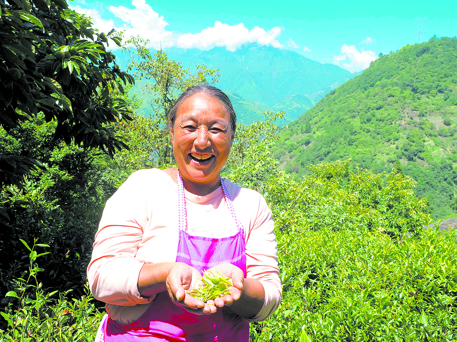 收獲新茶后,紫雅場(chǎng)村村民王美蓉喜笑顏開(kāi)。于譚陽(yáng) 攝
