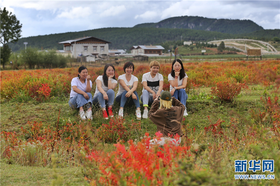 秋季,即將枯萎的狼毒花全身由嫩黃色逐漸變成深紅色,遠遠望去猶如天然的紅地毯,紅色的花海吸引游客紛紛拍照留念。