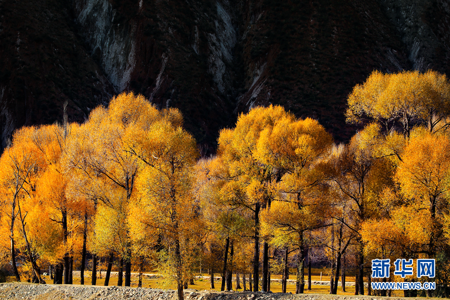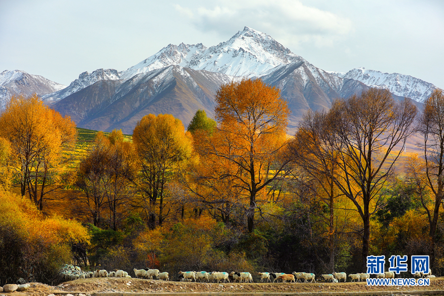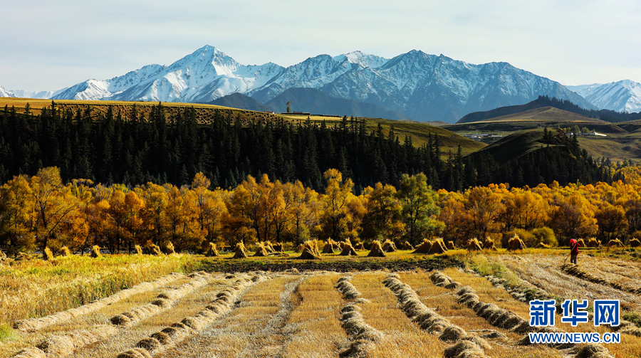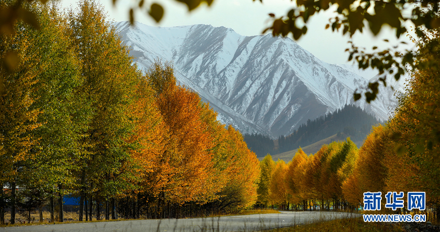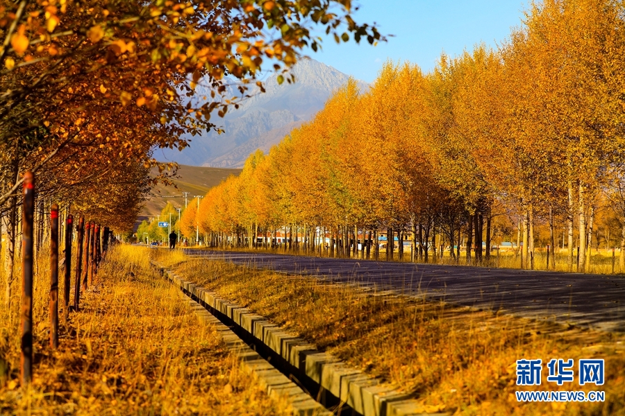 金黃色的樹木與遠山交相輝映,處處呈現(xiàn)出醉人的美景。新華網(wǎng) 蘇金元 攝