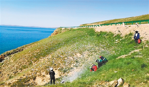 生態(tài)管護(hù)員在鄂陵湖邊清理垃圾。