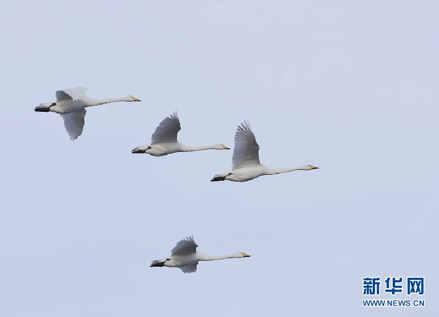 大天鵝在青海湖上空排隊(duì)飛翔。(資料圖)新華網(wǎng) 宋忠勇 攝