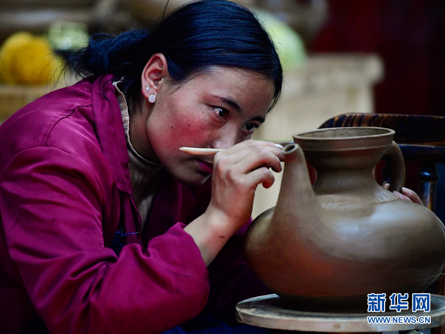 出身黑陶世家的謝格太就是當(dāng)?shù)赜忻暮谔占紟煛?014年,謝格太成立班瑪黑陶旅游產(chǎn)品開發(fā)有限責(zé)任公司,規(guī)?;a(chǎn)和銷售黑陶,并帶領(lǐng)學(xué)徒一起鉆研黑陶技藝,傳承和創(chuàng)新黑陶手工技藝文化。和泥、捏制、打磨、發(fā)酵、火燒、熏黑、拋光,經(jīng)過十幾道工序的磨煉,學(xué)徒們?cè)谥x格太的帶領(lǐng)下,不僅學(xué)到了技藝,傳承了技術(shù),每月還能拿到數(shù)千元的生活補(bǔ)助。