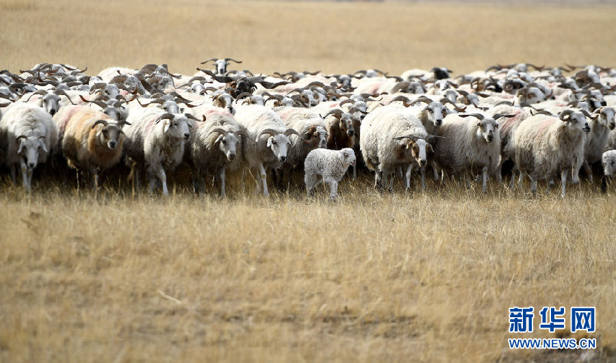初冬時節(jié),一場小雪浸潤了青海湖北岸的草原,披著薄紗的草原草色金黃,這里成為母羊產羔的大“產房”。